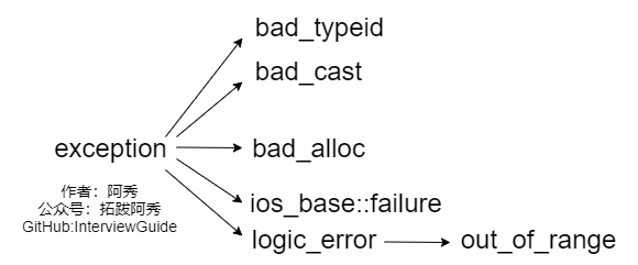 C++ 标准库中有一些类代表异常,这些类都是从 exception 类派生而来的,如下图所示
