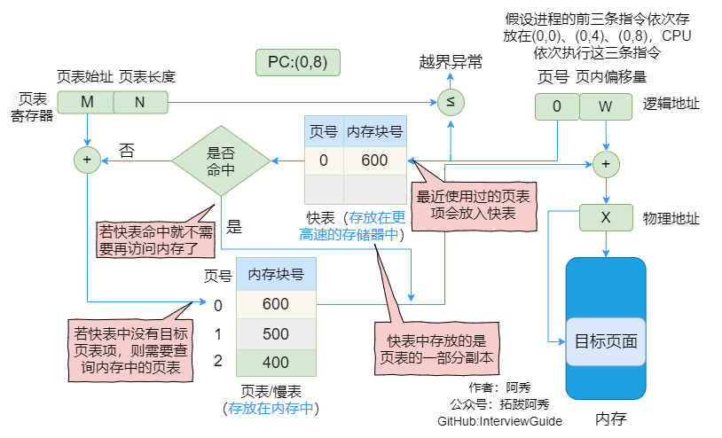 | 基本地址变换机构 | ①算页号、页内偏移量 ②检查页号合法性 ③查页表,找到页面存放的内存块号 ④根据内存块号与页内偏移量得到物理地址 ⑤访问目标内存单元 | 两次访存 |